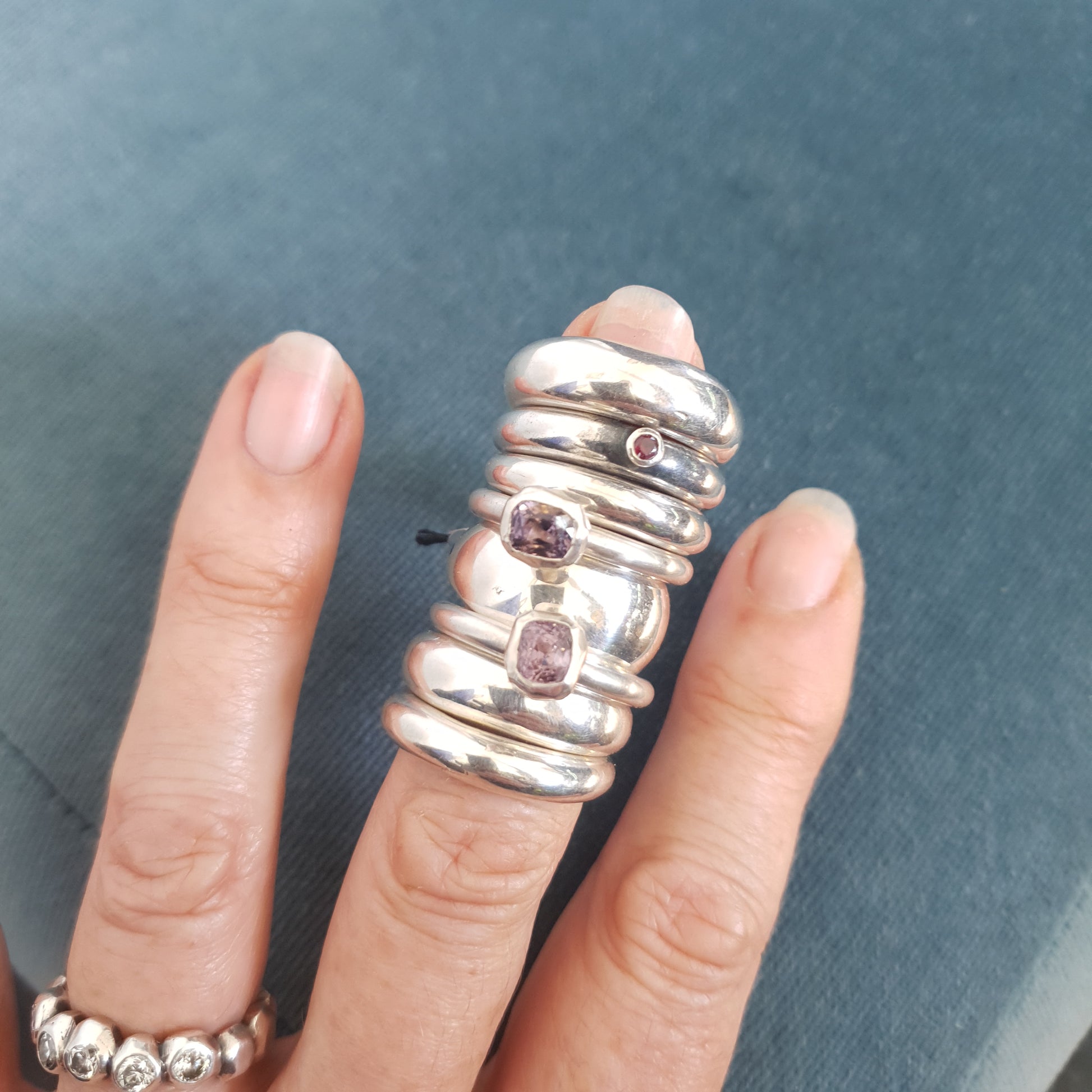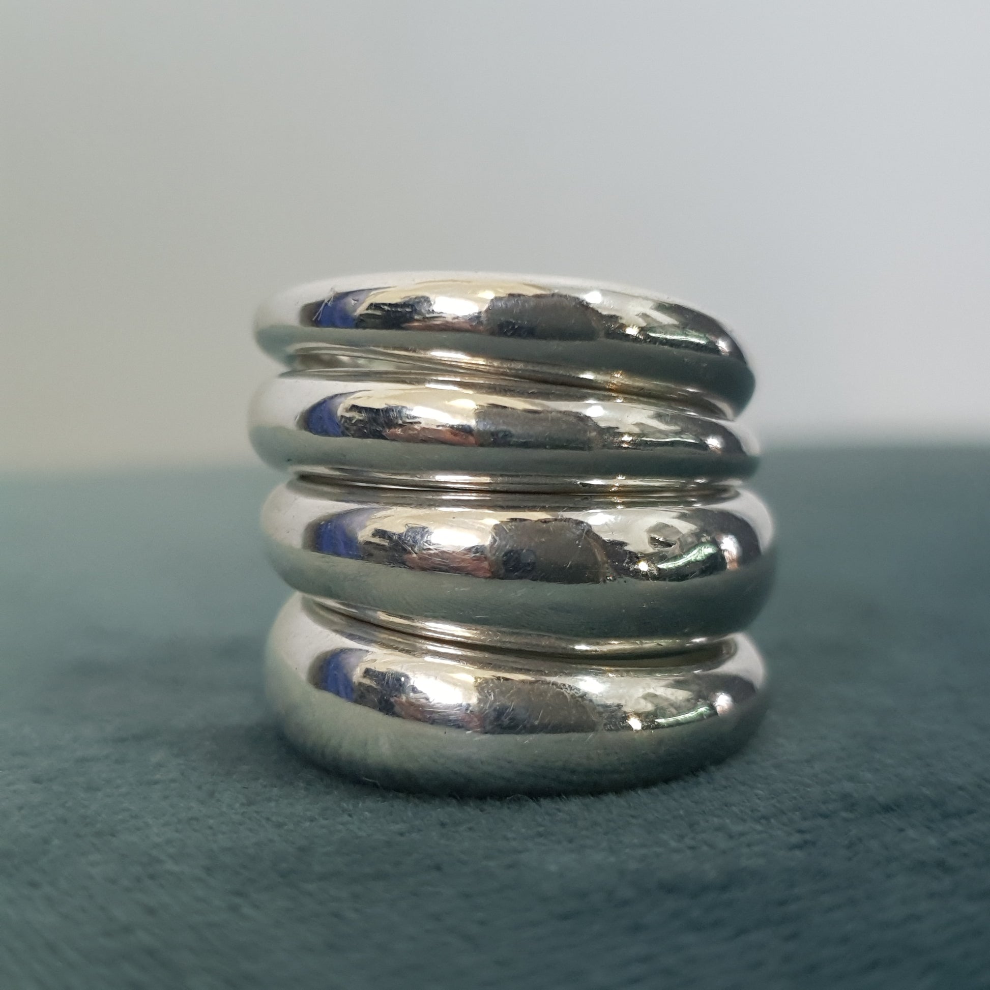 This organic shaped chunky silver band is perfect for stacking. The smooth flowing lines of this ring are an enduring classic that never goes out of style.